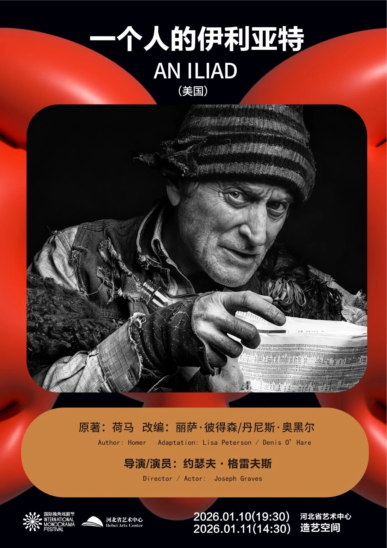 《一个人的伊利亚特》用极致舞台语言,给出了惊艳答案——它将《荷马史诗》中特洛伊战争的宏大叙事,凝缩成一出摄人心魄的独角戏,让一位“诗人”在舞台上独挑大梁,一人分饰数十余角,从阿喀琉斯的狂怒到赫克托尔的悲壮,尽数鲜活呈现。