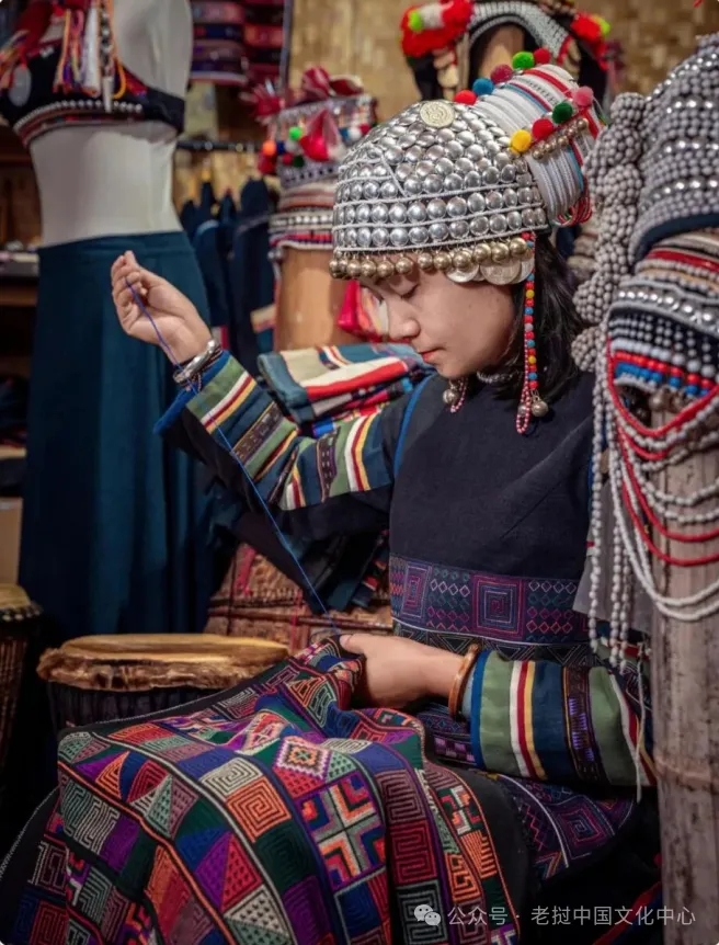 哈尼族刺绣伴随哈尼族服饰诞生已有千年历史。其依托纺、织、染、绣完整手工体系,以板蓝根等天然植物染制黑、蓝底布,用七彩丝线以平绣、挑花等针法绣制纹样。梯田、棕扇、日月星辰、山川草木等自然与民族符号为核心图案,色彩艳丽、构图灵动。如今这门手艺不断创新,融入现代设计走进日常,成为连接传统与当代的民族文化瑰宝。