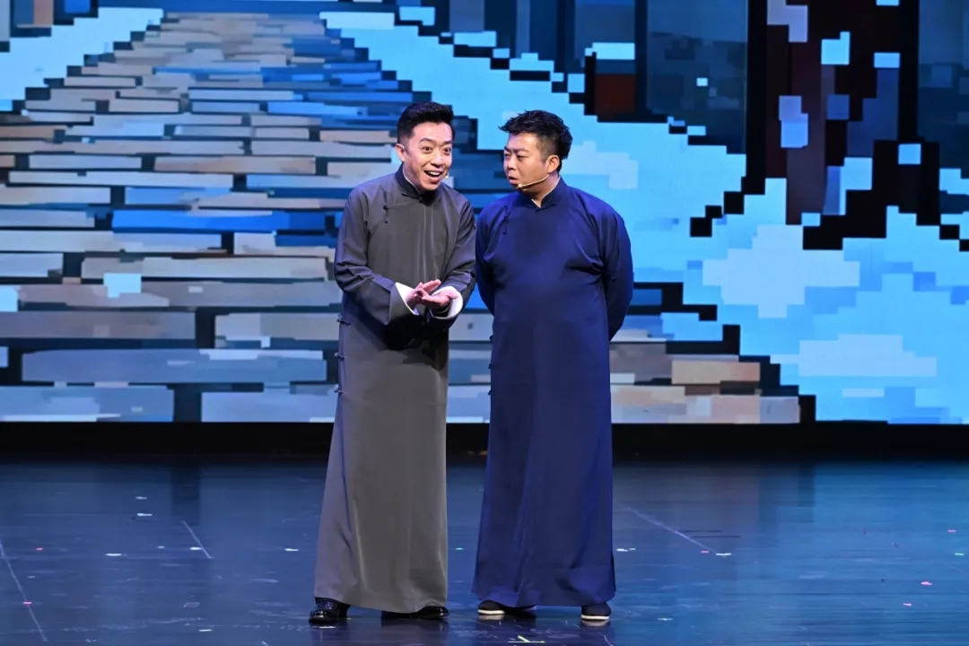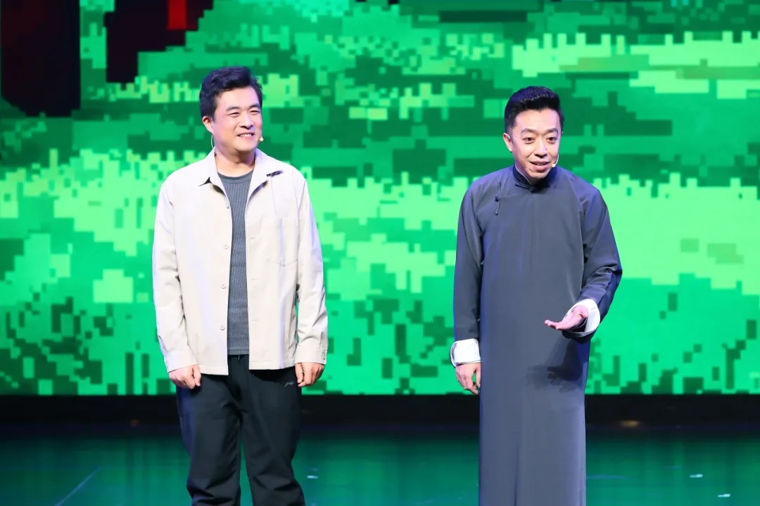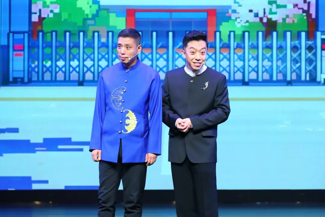 舞台背景大屏幕上出现了一个自称“哈哈”的简易线条人脸,操着京津混合口音的语言,以充满科技感的灯光秀展现了其独特的欢迎方式,并且不断介绍演员李菁出场,但其迟迟未登台。主持人和“救场”的演员都不是真人,而是几条指令下自动生成的AI形象。李菁没到场的原因是“哈哈”的人脸识别出了问题,将他挡在了门外。大屏幕影像中,身穿白色带有科技感条纹西服的李菁被要求眨眼、张嘴、摇头,“哈哈”又要求李菁做出一个搞怪的表情,也算三翻四抖。通过了识别,李菁终于出现在了舞台上,服装却是黑色西服。李菁的搭档盛伟,身穿蓝色大褂,一场人与AI的表演正式开始了。
